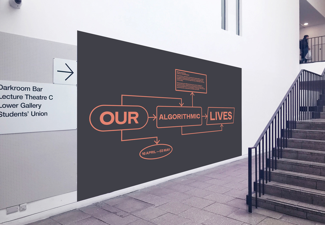Branding and identity design for 'Our Algorithmic Lives' exhibition at UAL. The show explored the use of algorithms within society as part of commercial control and personal exploitation. We developed a flexible identity system based on the diagrammatic visual language of algorithms which could be applied to a range of fixed and responsive formats.