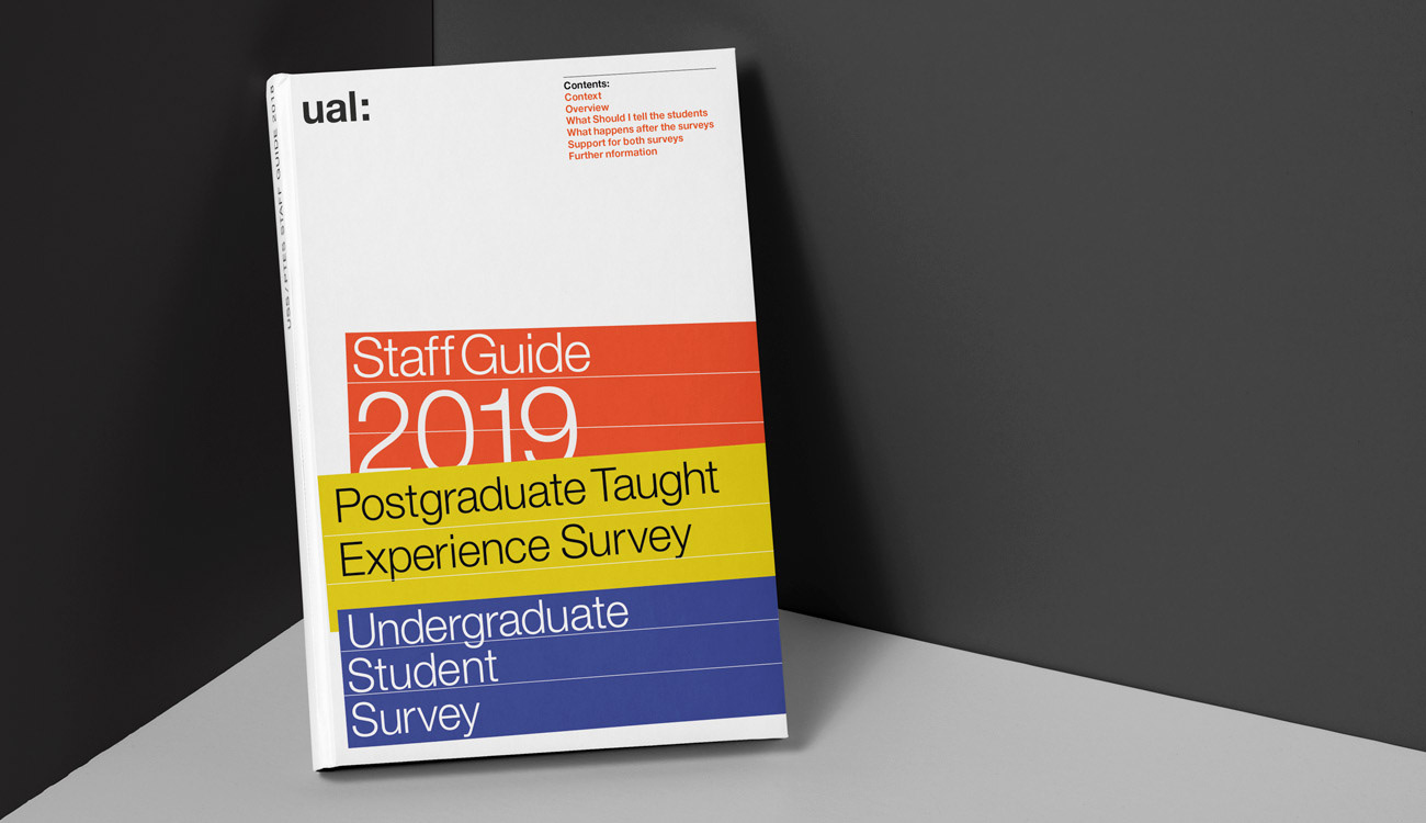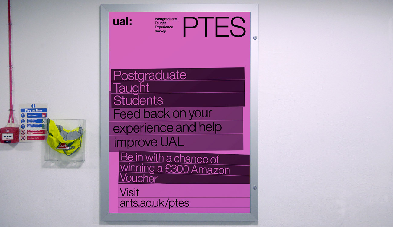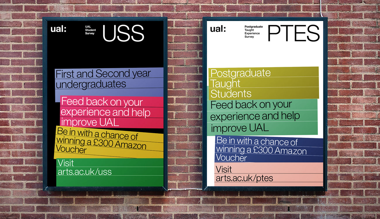 Campaign and identity design for the new student surveys at UAL. (PTES+USS). These are undergraduate and postgraduate opportunities to provide feedback on study and university experience.