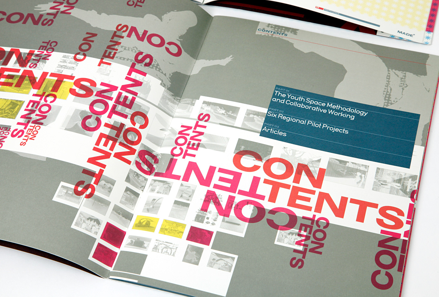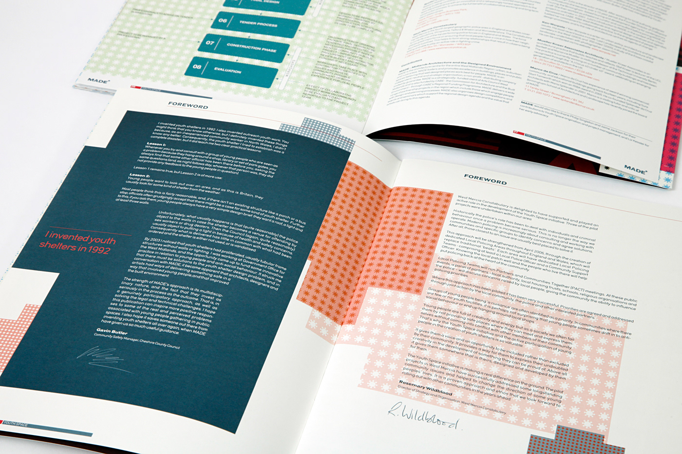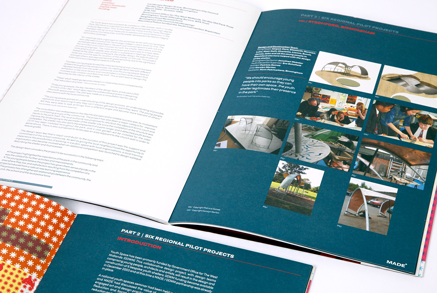 This is an annual review/report for the MADE group. The product delivers key statistical information about the group and lays out a series of case study architectural projects that are live within their area. The visual approach was aimed at reflecting the youthful nature and attitude of these architectural projects contained within the report and to stimulate increased funding.