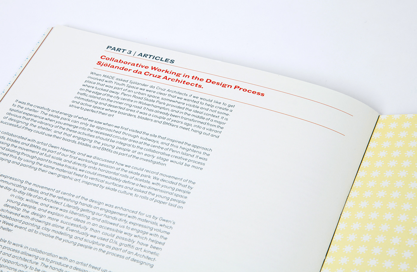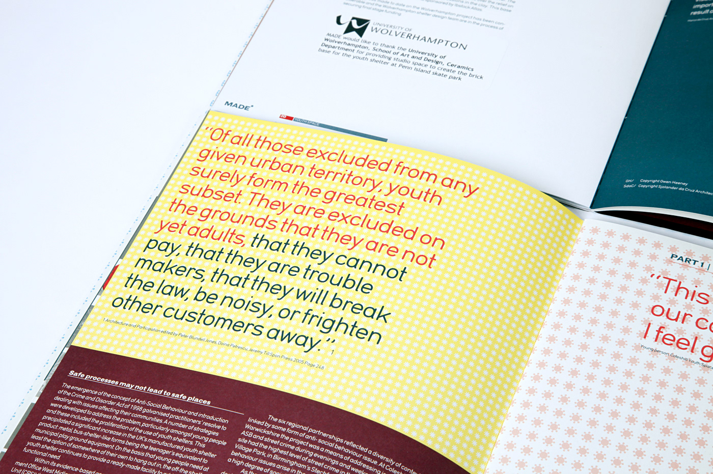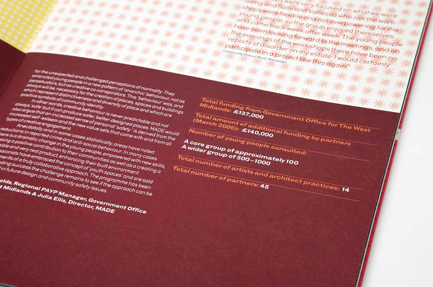 This is an annual review/report for the MADE group. The product delivers key statistical information about the group and lays out a series of case study architectural projects that are live within their area. The visual approach was aimed at reflecting the youthful nature and attitude of these architectural projects contained within the report and to stimulate increased funding.